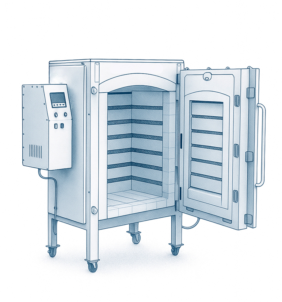 اگر حدود ۴۰٪ یا بیشتر از کوره پر شود، بهتر است ظروف در سراسر محفظه پخش شوند. ولی اگر کمتر از ۴۰٪ باشد، قطعات را در یک یا دو لایهی میانی با پایههای بلندتر بچینید تا جریان حرارت بهتر شود و فضای کافی اطراف ترموکوپل حفظ شود.