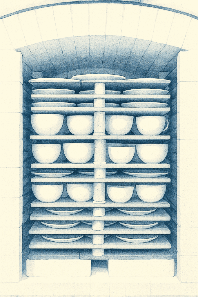 به همین دلیل، در بارگذاری اصولی، همیشه باید ارتفاع پایهها (Kiln Posts) بهگونهای انتخاب شود که حتی بلندترین قطعهی هر لایه، دستکم ۲ سانت فضای خالی تا صفحهی بعدی داشته باشد.